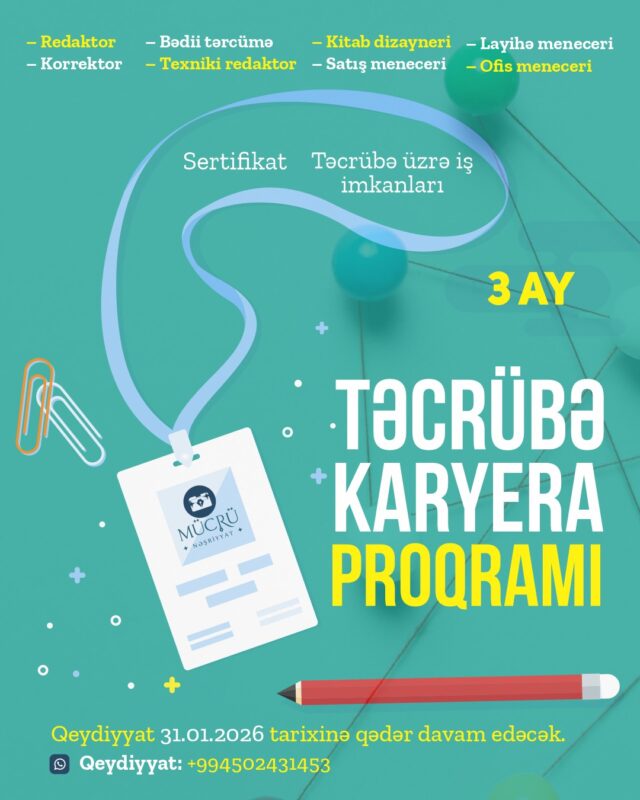 Hörmətli namizədlər, “Mücrü” nəşriyyatı 2026-cı ildə növbəti Təcrübə-Karyera Proqramı layihəsinə başladı. Bu proqram nəşriyyat sahəsində təcrübə və karyera qazanmaq istəyənlər üçün nəzərdə tutulmuşdur.